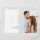 This modern save the date features modern calligraphy script in gold foil with a striped backer. Upload your own photo and customize the information to include your wedding details.