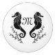 Two seahorse in a serpentine shape,is done in silhouette style. At the base of the seahorse is seaweed. Between the horse is the letter "M" the m is short for monogram and can be changed to a personalised initial.