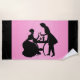 This custom beach towel has a romantic couple in Colonial period clothing sitting at a table drinking wine done in black silhouette on a bright pink background with black borders at the edges.