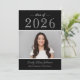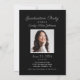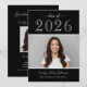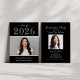 Modern graduation party invitation featuring “Class of 2026” in elegant script with a bold black layout and silver accent details. Personalise with the graduate name and school for a clean, timeless look. The back features a coordinating black design with “Graduation Party” wording and a framed photo. Perfect for a grad party or open house celebration.