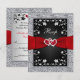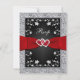 This romantic and dramatic black and silver grey floral wedding reply card has a PRINTED RIBBON, a pair of PRINTED diamond and red FAUX glitter joined jewel hearts on it, with silvery grey flowers and a FAUX silver foil border on it that matches the wedding invitation shown below. ****PLEASE NOTE that everything will print as it appears on your monitor, so if you have typos, alignment, or sizing issues, please contact me for help BEFORE you order. I can't do anything once the order is placed with Zazzle. If you need any other matching items, please email niteowlstudio@gmail.com.
