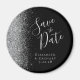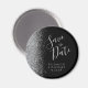 The left edge of this elegant Save the Date magnet features a silver faux glitter border. The customisable text combines silver grey handwriting script with serif font on a black background.