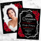 Black red silver Quinceanera celebration invitation. Features script font, red roses, tiara and glitter silver. Classy design with photo on the back. Perfect for an elegant princess style glam celebration. Personalise with your own details. Printed Zazzle invitations or instant download digital printable template.