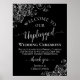This beautiful "Unplugged" sign that serves as a delightful greeting for your wedding guests while also requesting them to switch off their phones, cameras, and gadgets, ensuring a seamless and uninterrupted ceremony. The sign showcases an elegant black and silver design with graceful cursive calligraphy and elaborate silver gray faux foil curls and swirls adorning the corners. The message reads: Welcome to our unplugged Wedding Ceremony. Please turn off your Phones, Cameras and Devices So we can all enjoy the Ceremony without Disruptions.