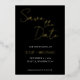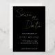 Simple, gold foil print wedding Save the Date card with white, stylised script on black background. Edit names, date and location with your own wedding information. Change foil colour if desired. Background colour may be changed as well to match your wedding colour scheme.