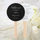 Wedding day program printed on a round style hand fan that features a black background on the front side with the bride and groom names in white, stylised script. Back side of program lists the wedding party participants and ceremony rites on a white background with dark grey lettering. Edit hand fan and replace wedding program info with your own. Perfect for an indoor or outdoor wedding ceremony! Select number of hand fan programs desired.