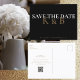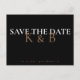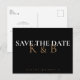Black simple monogram save the date. Postcard. Gold, black and white text.