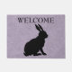 This outdoor welcome door mat has a black sitting rabbit silhouette on a pretty light purple with a marbled pattern. Customise the Welcome text with the template.