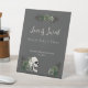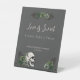 This elegant gothic Irish St. Patrick's Day Bridal Shower favours tabletop sign features hand-drawn Irish & gothic themed illustrations in black ink, showcasing a skull adorned with green roses, leaves, berries, wildflowers and green clovers. The back features a matching pattern with these same elements against the same pink background.