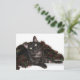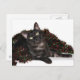 Black smoke cat entangled in dark coloured Christmas garland looking up at you photo Christmas postcard