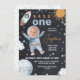 Cute boy's outer-space themed first birthday invitation featuring a spaceship, various stars, planet and sun as well as an astronaut with a photo inside the space helmet.  This first trip around the sun birthday invitation is a cute way to invite guests to an outer space themed first birthday party.