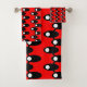 This towel set has a mid-century modern design of black ovals with white circles connected by white lines on a field of red. Want different colours? Message me.