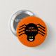 This button features a spooky black spider with eight hairy legs, yellow eyes with big black pupils and its mouth open showing its fangs. The background is orange and there is orange text on the back of the spider that says "happy Halloween".