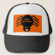 this Halloween hat features a spooky black spider with eight hairy legs, yellow eyes with big black pupils and its mouth open showing its fangs. The background is orange and the spider has orange text on its back that says "Happy Halloween"