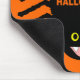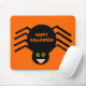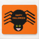 This brilliant Halloween mousepad features a spooky black spider with eight hairy legs, yellow eyes with big black pupils and its mouth open showing its fangs. The background is orange and there is orange text on the back of the spider that says "happy Halloween".