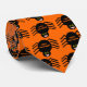 This cute Halloween tie features a spooky tie with lots of black spiders with eight hairy legs, yellow eyes with big black pupils and their mouths open showing their fangs. The tie is orange and there is orange text on the back of all the spiders that says "happy Halloween".