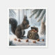 A squirrel holds an acorn in a snowy forest surrounded by a collection of acorns in a small leather purse