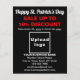 Black flyer for St. Patrick's Day that you can customise by specifying the discount percentage, sale dates, uploading your business logo, typing your business name, address, phone number, email and website. Customise it and distribute it to attract more customers to buy your products or clients to like your services. Please check the appearance of the front and back sides after uploading logo and typing texts. If the appearance is pleasing to you, you can place your order now. If you need to resize and reposition the logo and texts to fit on this flyer or on the size that you've chosen, please adjust in the design tool. You can also change the background colour, font colour and font style in the design tool. Happy St. Patrick's Day! Wishing you the best of luck, joy and more sales this holiday.