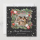 Elegant black photo Christmas card featuring a photo inside a watercolor Christmas wreath of spruce branches, holly and Christmas decoration. Easily personalise this starry photo Christmas card with your photo and text.