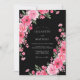 This design features a striking contrast between a deep midnight backdrop and vibrant blooming florals. A lush palette of fuchsia, blush pink, and soft rose tones creates a bold, romantic aesthetic. Detailed illustrations of open roses, ranunculus, and delicate cherry blossoms are paired with muted sage greenery for a sophisticated look.
