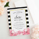 Chic baby shower invitations feature a classic black and white stripe background, faux gold foil border, and a bottom border of pink watercolor peony flowers. Personalize with your baby shower details in black lettering.