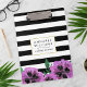 Modern floral clipboard features classic black and white stripes with a purple watercolor pansy flower and faux gold border. Customise with a monogram, name or text of your choice!