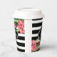 Black and white geometric stripes and pink exotic flowers. Customisable paper cup template
