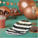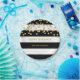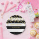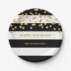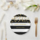 Happy Holidays Christmas paper plates with gold confetti and black and white stripes pattern. Customisable with your name.