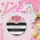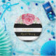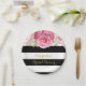 Customisable name bridal shower party plates in black and white stripes pattern with vintage pink watercolor flowers.