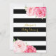 Personalised baby shower invitations with black and white stripes pattern, gold details and pretty pink watercolor vintage flowers. Perfect for a spring or summer baby shower.