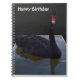 Pictured is a black swan swimming in a dimension pond of water. birthday message is included