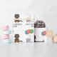 Cute birthday theme design featuring Destei's original cartoon illustration of a cute black and tan colour Cavalier King Charles Spaniel breed dog. Next to the dog there are colourful birthday balloons tied on a dog bone and a purple and yellow colour present box. The background has a playful pattern of colourful pastel confetti on a white background. There is also a personalizable text area.