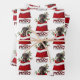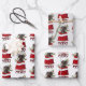 The repeated pattern on these Christmas wrapping paper sheets is an image of a black and tan Dachshund dog peeking out from a red and white Holiday gift bag. Behind him is a sprig of holly and red berries. Stylised red and black buffalo plaid text says MERRY CHRISTMAS". The background on two of the sheets in this set is white, while the third sheet is silver.