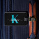 This simple, elegant black luggage tag with your first name in a trendy script font in white and your first initial in a modern cap font in teal on one side and your name, address and phone number on the other would look fabulous on your suitcases. It's stylish and trendy and yet very classic.