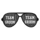 Black team groom bachelor party shades. Also customisable / available for team bride. Funny props for soon to be married men. Fun wedding / marriage accessory for groom to be and best man, groomsmen. Boys night out / Stag night gathering. Cool aviator sunglasses with custom personalised text. Customisable frame colour and background colour. Gag party props.
