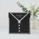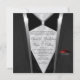Tuxedo Invitation set on a pearl grey damask with silk look trim and diamond love knot monogram accented with a red silk peak fold pocket. Front wrapped look tuxedo bow with diamond buttons, Or look again and it is a sherry wine glass with diamond stem.