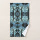 Here is a gorgeous bath towel design featuring an abstract interpretation of the view from the bottom of a very tall tulip tree looking way up to the top. The blue twilight sky creates an interesting lacy geometric abstract pattern of black silhouetted trunk and branches.