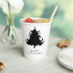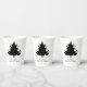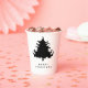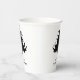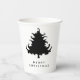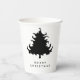 Merry Christmas paper cups in black and white. Pine tree with swirling branches in black is the image on front and back. Customise with text that also prints on both sides, beneath the tree design.