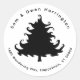 Black tree round stickers to use as a return address and envelope seal. A Christmas pine tree, with swirling branches, is the design. Stickers come in two sizes. Text is curved around the top for name, or names. Include the address in text that curves around the bottom. Minimalist design in black and white with printed text.
