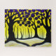 The image shows a painting of a forest with black trees. The leaves on the trees are a deep purple colour, and they seem to glow in the sunlight. The forest floor is covered in a thick layer of white. The background of the design is a bright yellow colour, which helps to make the purple trees stand out. The purple trees are both striking and otherworldly, and they create a sense of wonder and awe. The bright yellow background helps to balance the colours, and it also creates a sense of warmth and optimism.