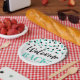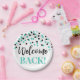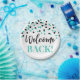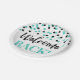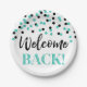 Welcome back paper plates in Turquoise and black confetti pattern.