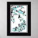 Black, turquoise blue peacock and cherry blossoms custom design, featuring a black, aqua silhouette of a peacock bird and a cherry branch -sakura tree- with lovely flowers with metallic crumbled texture effect on white background and a black border around it. An elegant, floral template design with an oriental Asian flair. This girly design is fully customisable.