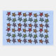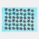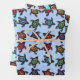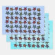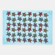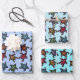 This set of wrapping paper sheets have a repeated image black turtles with colourful abstract markings on their shells in various colours on backgrounds of shades of blue.