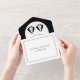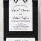 Black and white tuxedo Mr and Mr two grooms gay All in One wedding Invitation. This elegant wedding invitation features a sophisticated black and white design, specifically tailored for a Mr & Mr gay wedding. The primary visual element thoughtfully showcases the upper portion of two gentlemen's formal suits, complete with distinguished bow ties, indicating the attire of the two grooms. The names of the grooms are in script typography. All elements are placed in a white arch with black border. This clear and cohesive design effectively conveys the joyous union and the formal, yet personal, tone of the event.