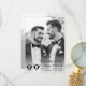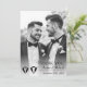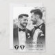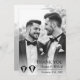 Black tuxedo two grooms gay wedding photo Thank You card. This elegant wedding design features a sophisticated black and white design, with a photo of the happy couple. It also showcases the upper portion of two gentlemen's formal suits, complete with distinguished bow ties, indicating the attire of the two grooms. The bacl includes a faded photo of the couple and the Thak You message.