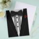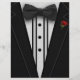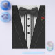 A black tuxedo with a bow tie and red rose.