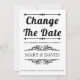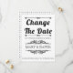 Vintage elements and black and white typography wedding Change the Date postponement announcement. This elegant wedding design displays the text "Change the Date" in bold black typography and vintage elements that form frames for the text. The back features a geometric pattern.