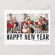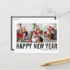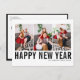 Happy New Year! Customisable Happy New Year photo collage postcard featuring black simple typography. Personalise by adding three photos, names, year and other details. This modern New Year postcard is available in other colours and cardstock.