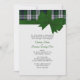 Elegant green, blue, and white Black Watch Dress tartan plaid, sets the backdrop for this Scottish inspired wedding invitation. Graphics of a watercolor paper and a green satin looking bow, decorates the front of the invitation. All text is ready to personalise for your special day. Matching products are available.