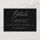 This elegant wedding details enclosure card features a black background with delicate calligraphy style script heading and classic serif body text. Perfect for sharing guest information like accommodation blocks, wedding websites, or special event notes. Its minimalist design adds a touch of sophistication and pairs seamlessly with formal, modern, or black-tie wedding suites.